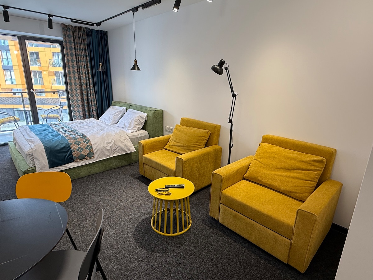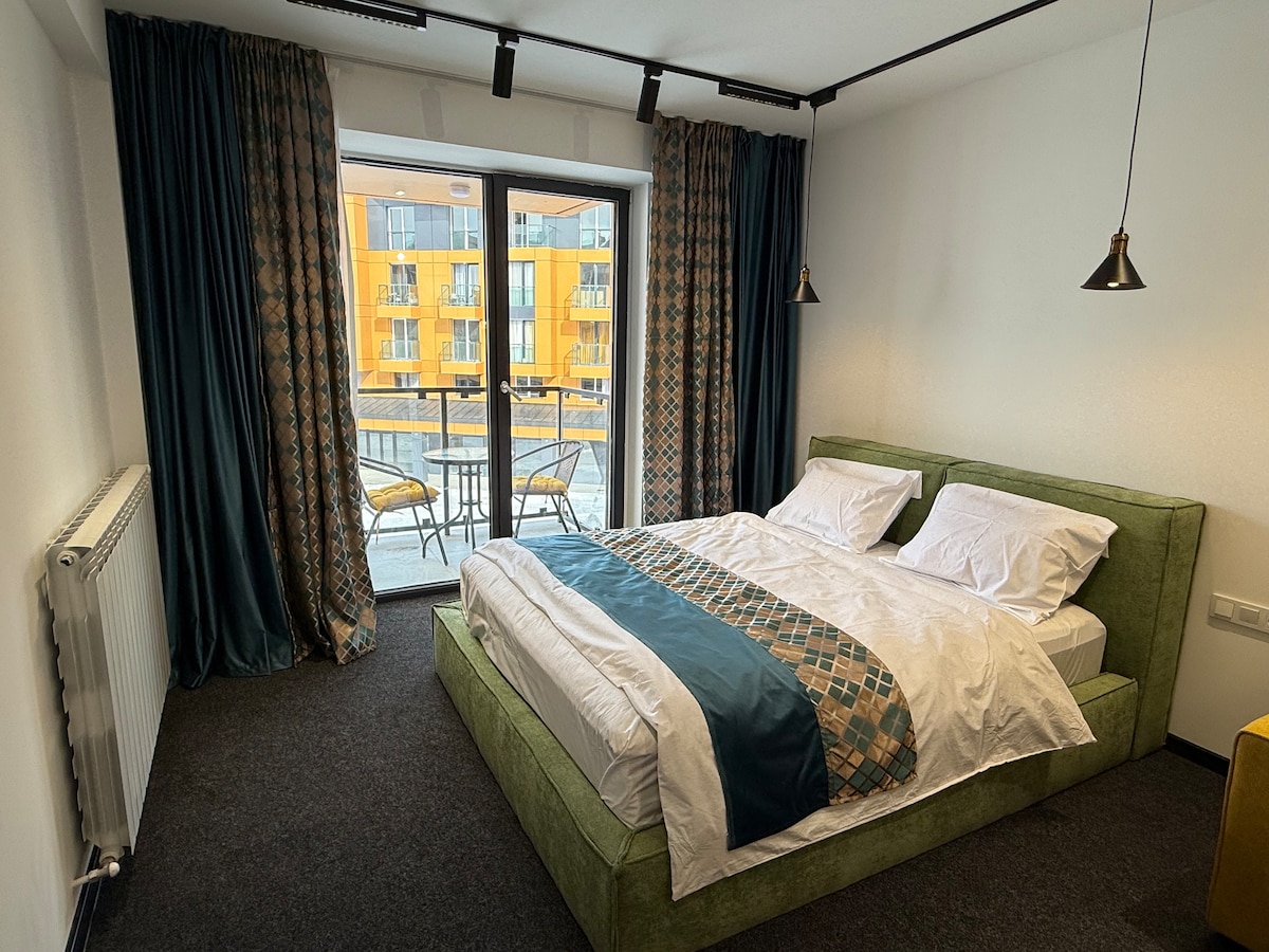 Wake up to the Greater Caucasus range. The apartment faces the mountains — no obstruction, no noise.